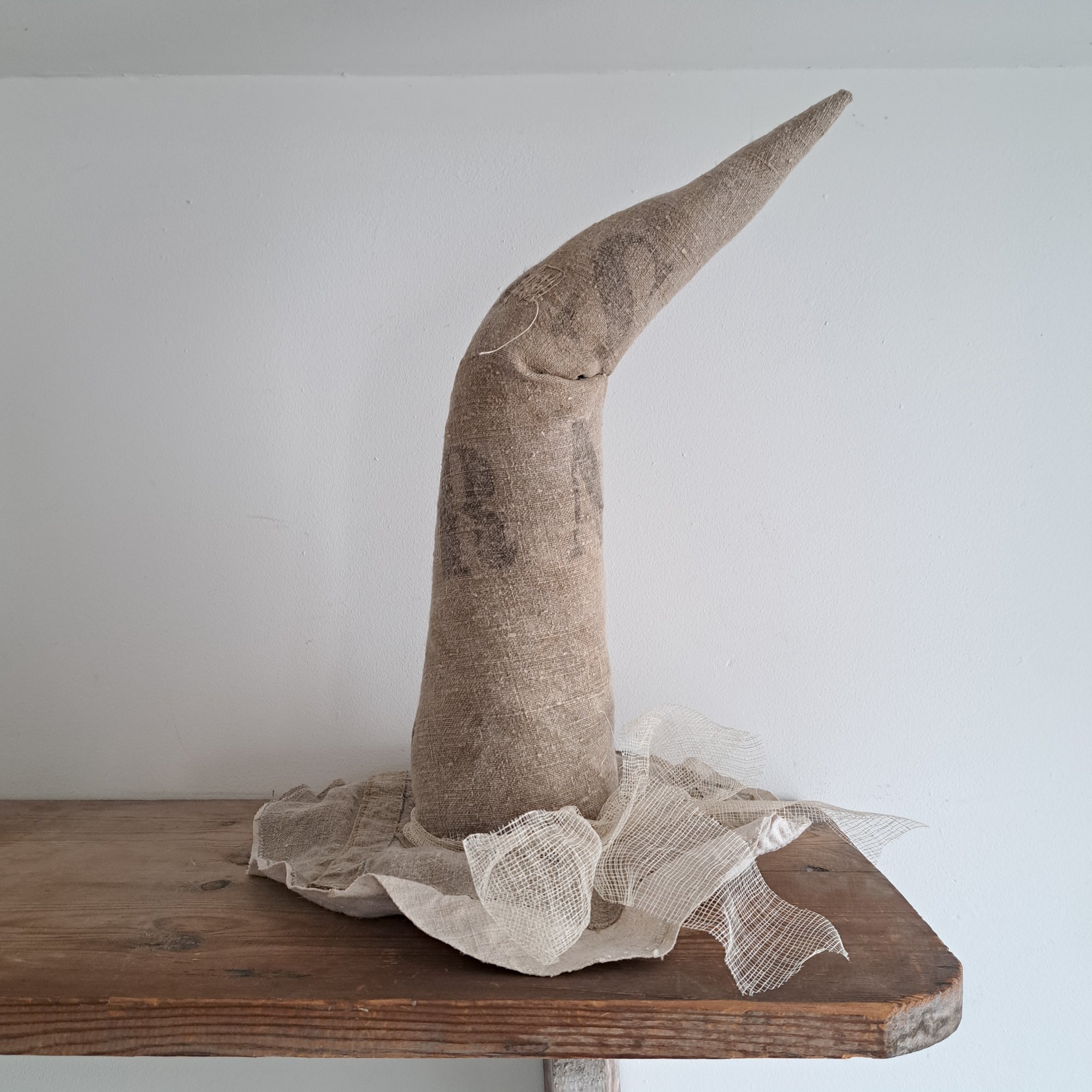 Handmade by me - wonky and rather rustic witch hat made from an old piece of French postal sack.