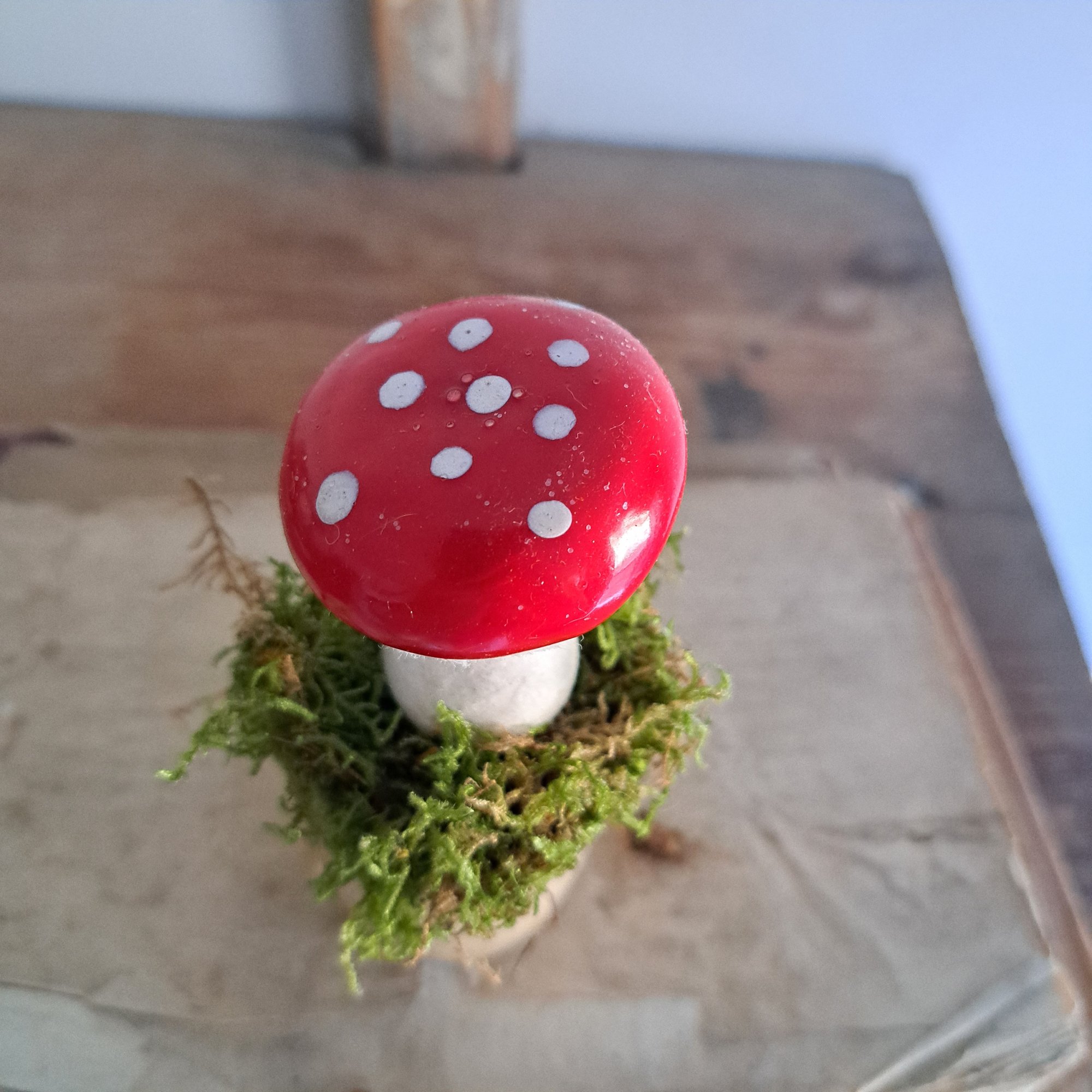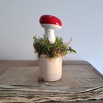 Wonderful vintage papermache toadstool in an antique weathered pot. Fabulously quirky winter decoration for your shelf.