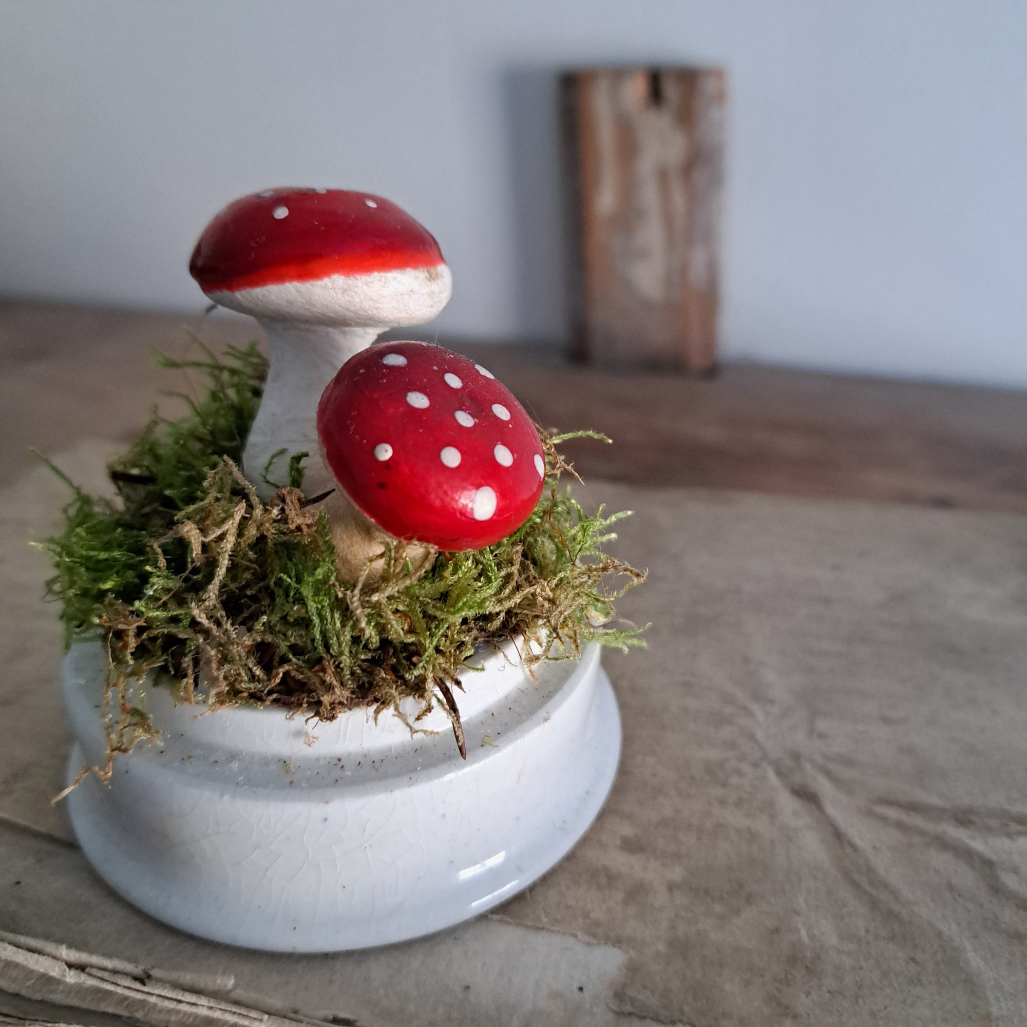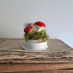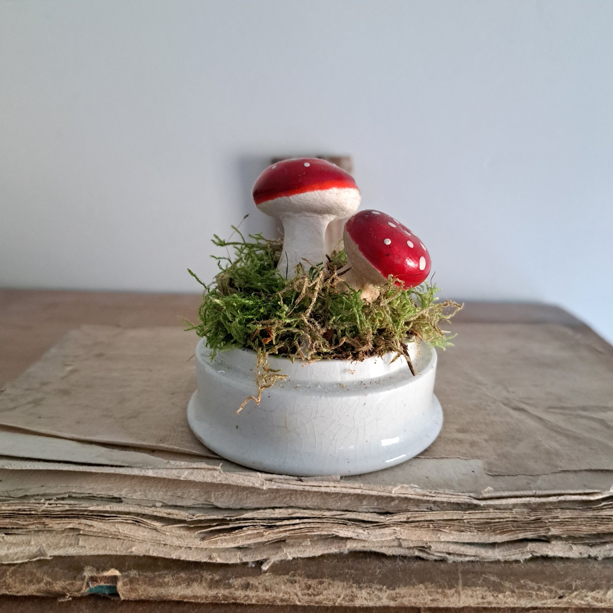 Wonderful vintage papermache toadstools in antique weathered pot. Fabulously quirky winter decoration for your shelf.